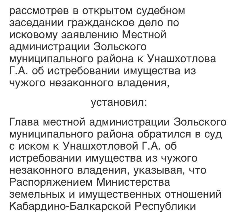 В 2016 году Администрация Зольского района обратилась  в суд с иском  об изъятии у нее квартир на том основании, что общежитие признано нежилым помещением, и что ответчица проживает там незаконно. Администрация исходила из того факта, что здание общежития сначала находилось в республиканской собственности, а затем было передано в муниципальную. Однако, суды и первой и второй инстанций подтвердили законность проживания Унашхотловой.