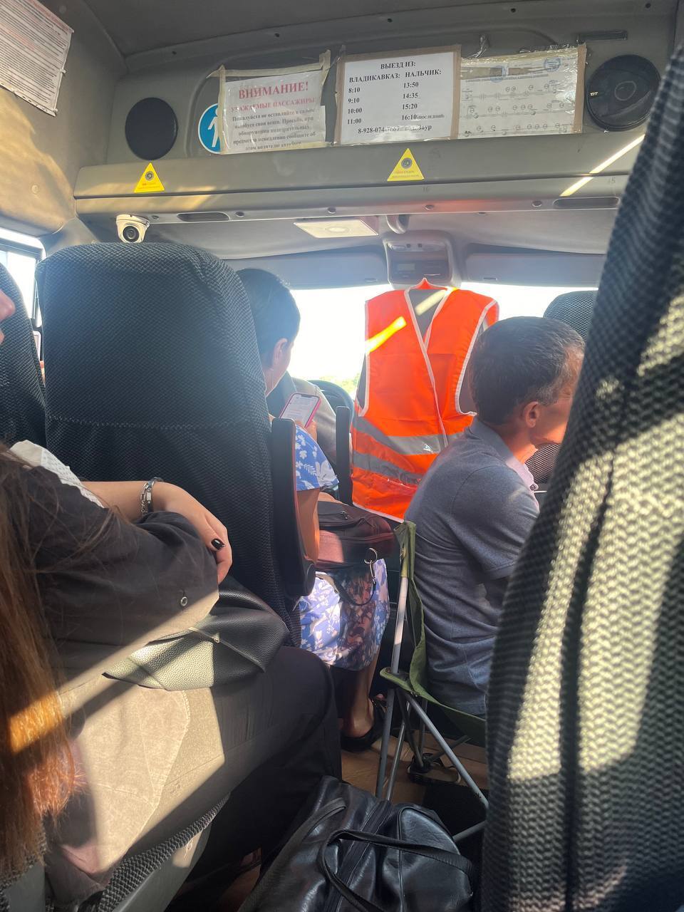 Маршрутки Владикавказ-Нальчик-Владикавказ отправляются с 8 утра каждый час, последний отходит из Нальчика в 16:10. Плохо, что нет больше рейсов, явно этого мало. Вот как мы ехали обратно. Были ещё желающие, но стульчики уже ставить было некуда: