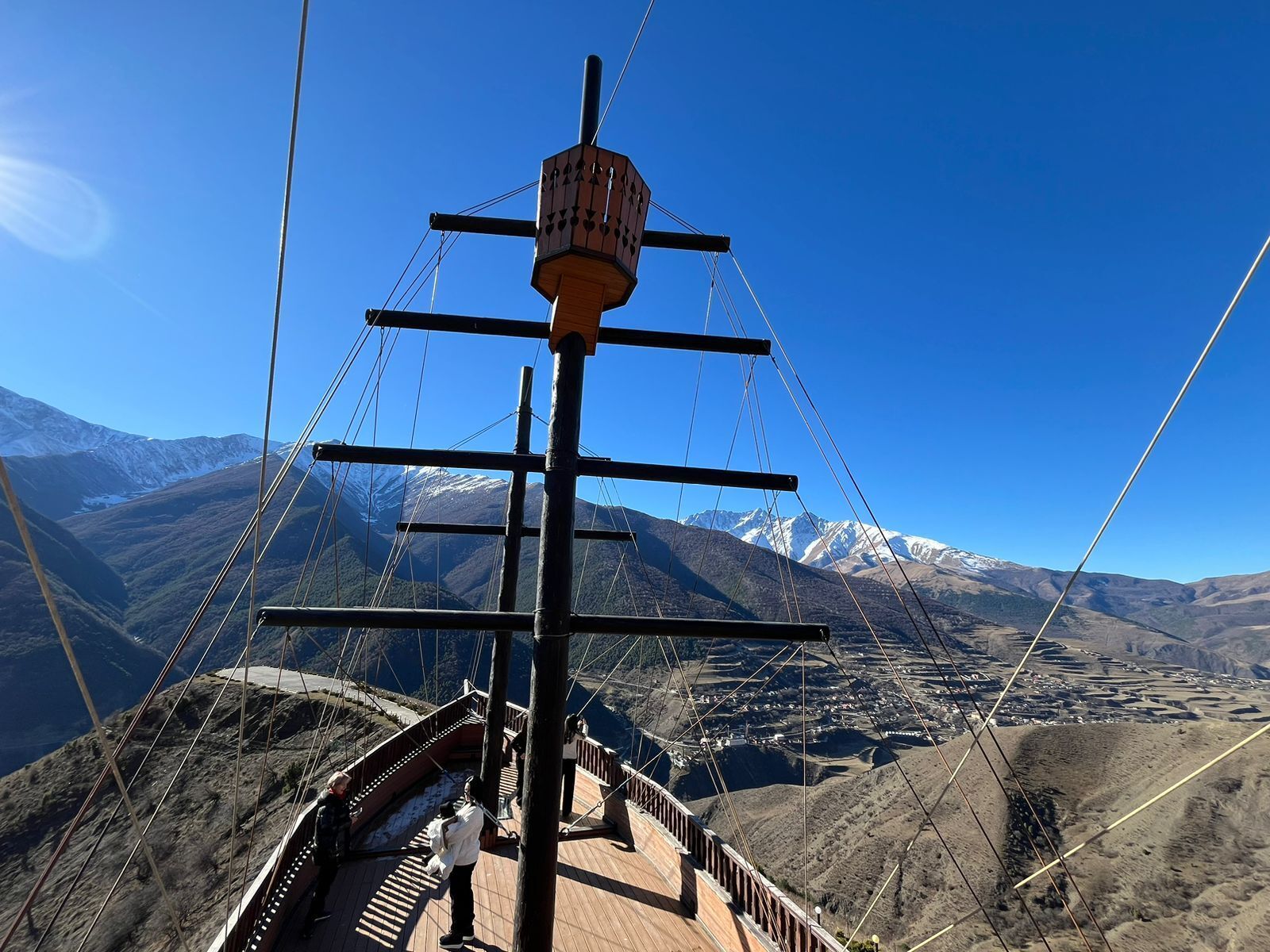 Смотровая находится в частных владениях, это огромная территория, застроенная гостевыми домами, есть своя мечеть и даже вертолётная площадка. Видимо, паспорт показывать на посту не надо, если летишь сюда на вертолёте. Однако, номера тут не сдаются, всё хозяйство только для отдыха родственников Куштова. Видимо, того самого бизнесмена, который известен нам всем по новостям.