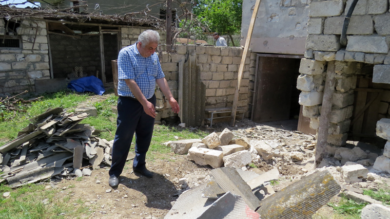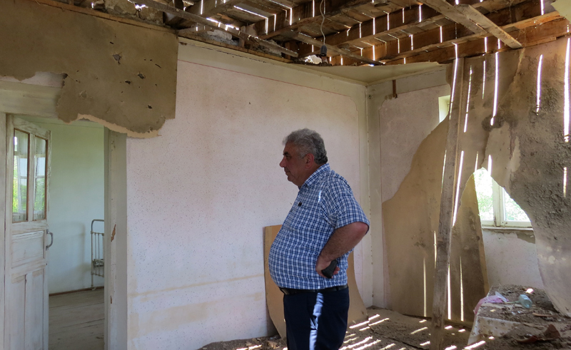 После школы я попросил Мишу Гюрджяна проехаться по Мартакерту, показать разрушения. «В Мартакерте пострадало 17 домов, остальные, некоторые разрушены полностью, некоторые частично – выбиты двери, стёкла. Население возвращается, заново обустраивается. Четыре дома уже полностью восстановлены, остальные на очереди, по плану будут восстановлены. Государство нам помогает в этом деле, без этого было бы очень трудно» - сказал г-н Гюрджян. Мы подъехали к такому дому, где Гюрджян показал место, куда, рядом с домом, попал артиллерийский снаряд, нанесший большой ущерб.