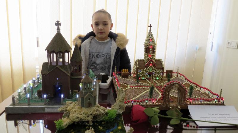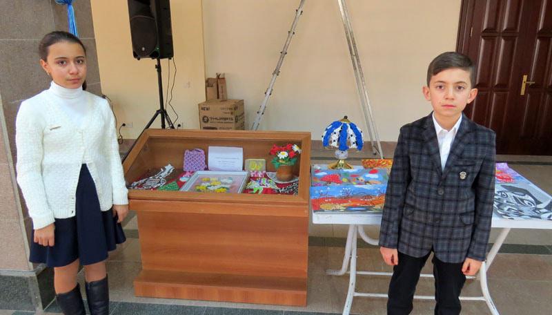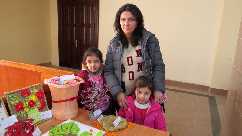 Лариса Давидян, жена военнослужащего с дочкой Маргаритой (8 лет) и Марианной (4 года) из с.Шош Аскеранского района рядом со своими работами.