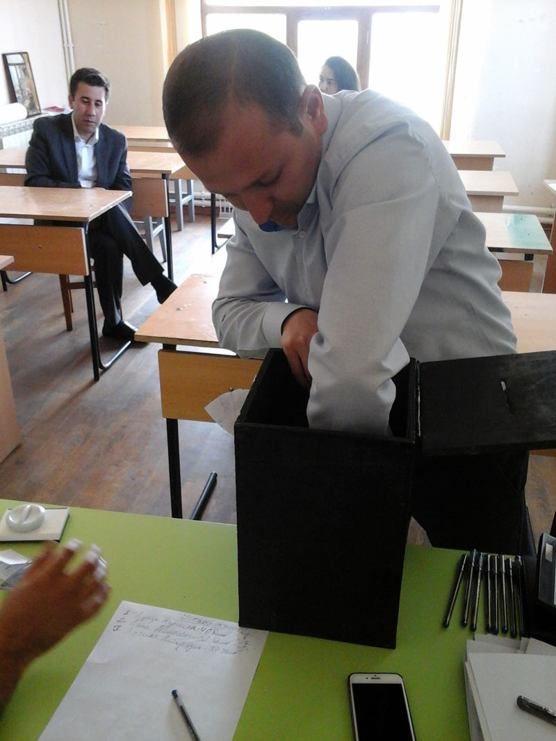 Игорь Айрапетян достаёт из ящика бюллетени голосования.