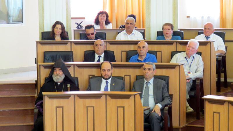 В нижнем ряду, слева на право: архиепископ Мартиросян, министр образования и спорта Армении Араик Арутюнян, и министр иностранных дел Арцаха Масис Маилян.