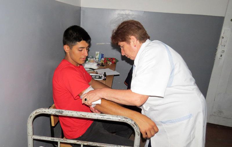 Начальник медслужбы лагеря Стелла Даниелян сделала йодовую клетку и перевязывает руку Шагену Григоряну, растянувшему руку во время игры в волейбол.