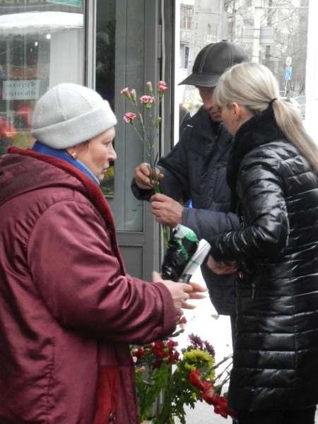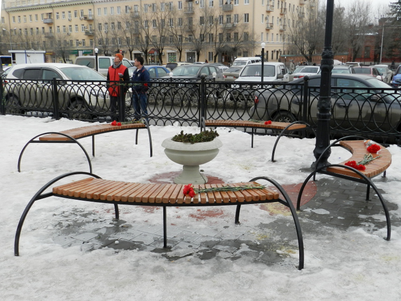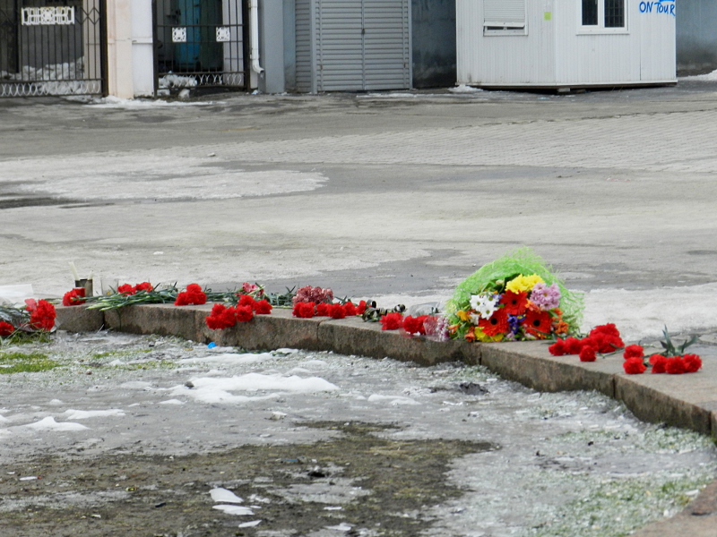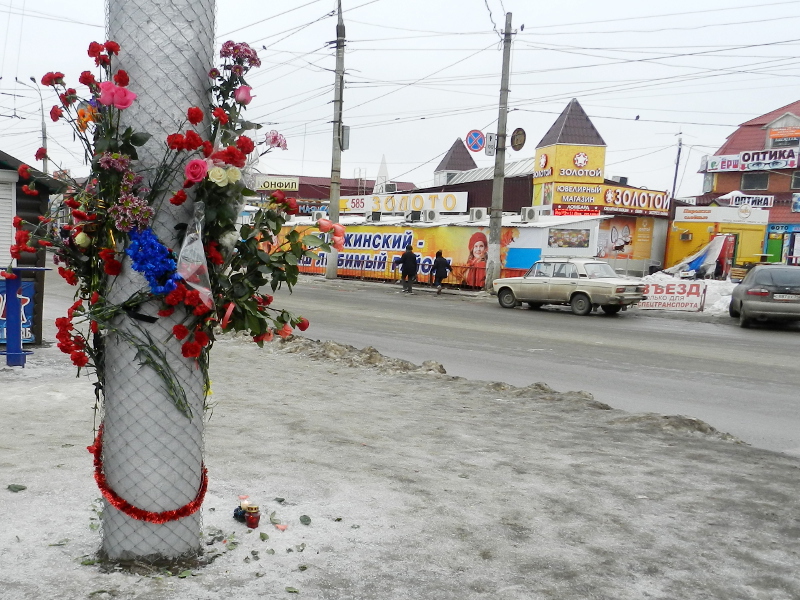 Улица Качинцев, где 30 декабря был взорван троллейбус. Цветы на столбе уличного освещения.