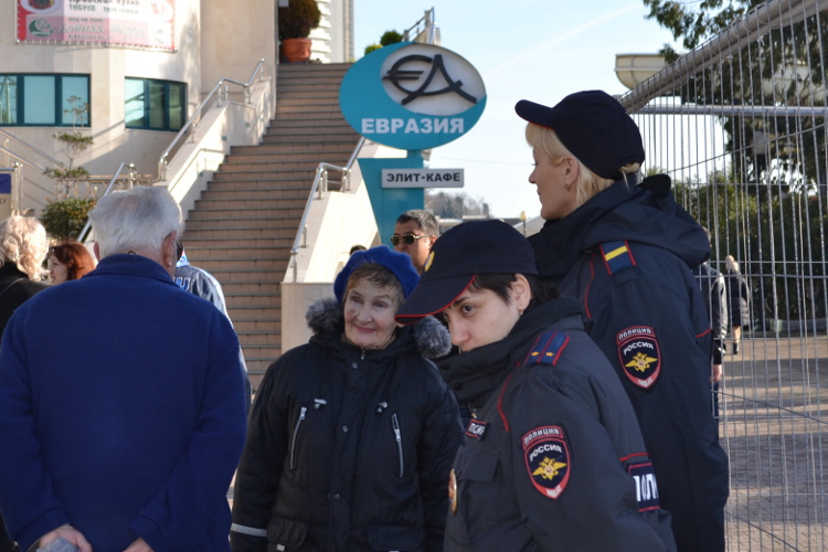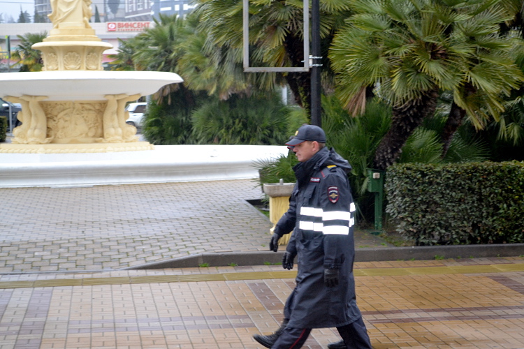 Полицейский патруль на площади у здания Морского вокзала Сочи.
