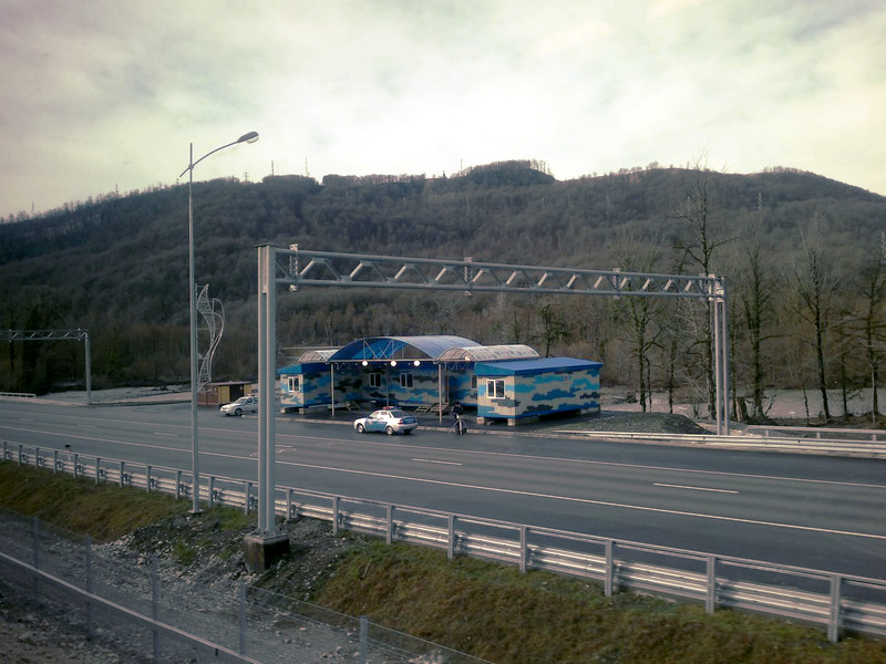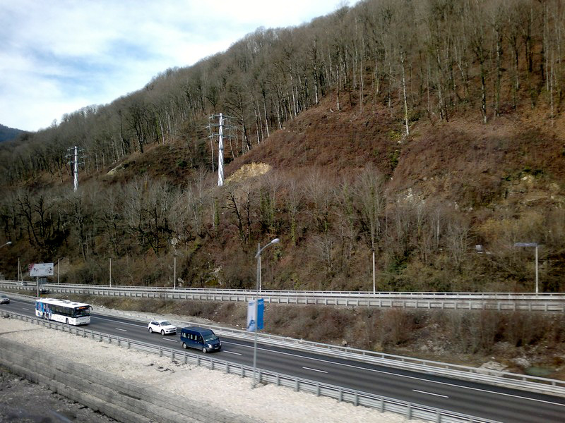 Вид из окна электропоезда «Ласточка» на участок совмещенной скоростной автомобильной и железной дороги Адлер - Красная Поляна, построенной к Олимпиаде.