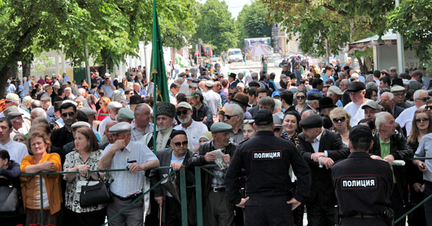 Участники памятных мероприятий возле памятника "Адыгам, жертвам политических событий 1753-1864 годов" в Кабардино-Балкарии.