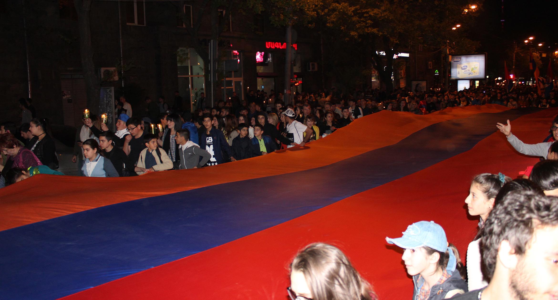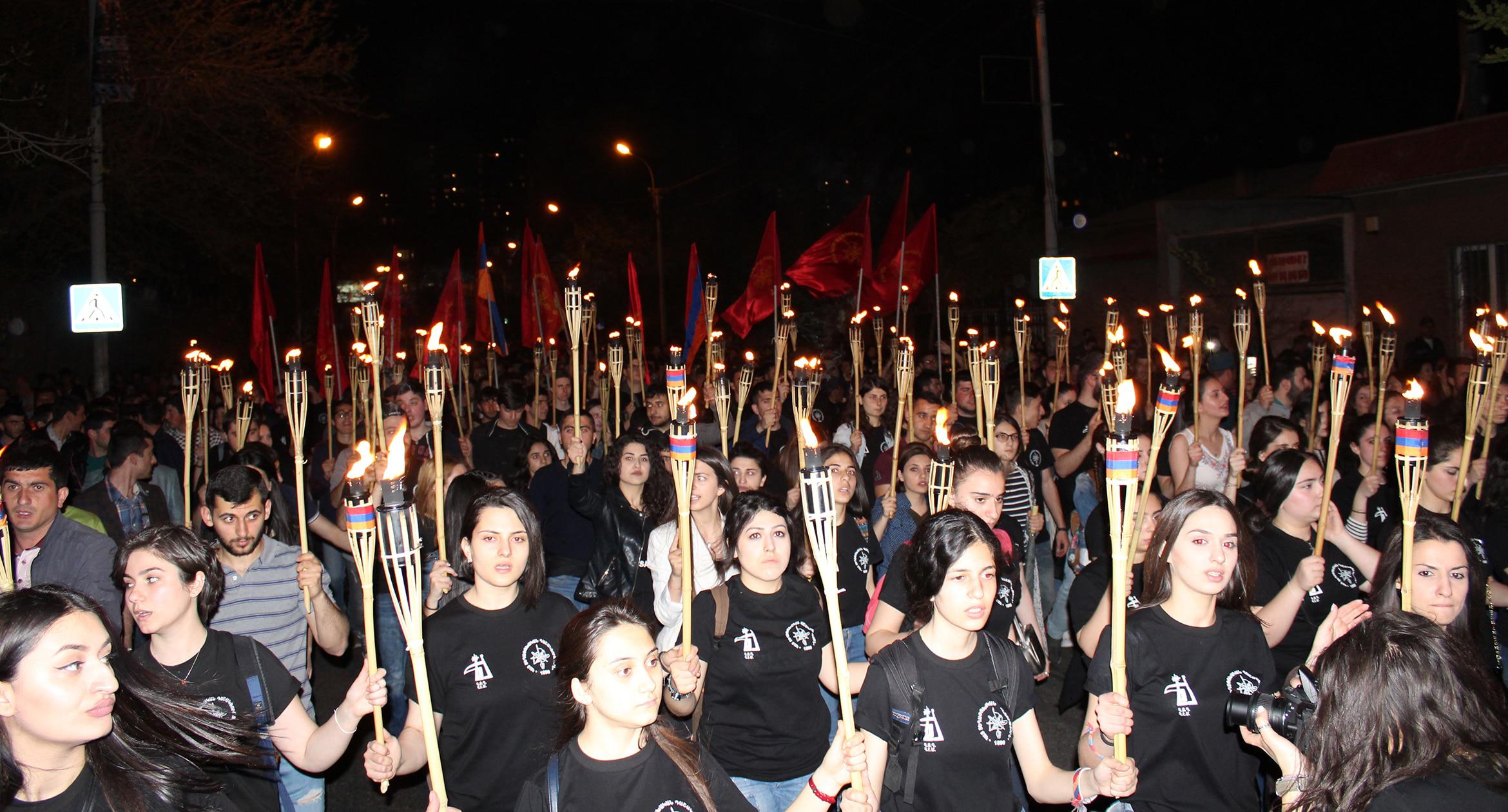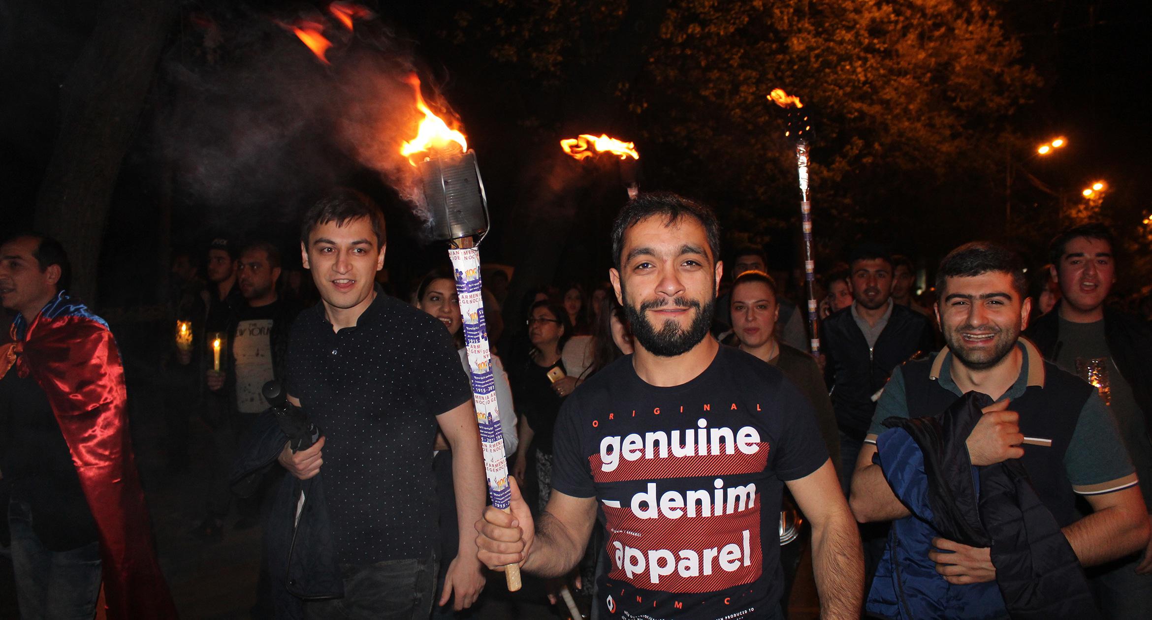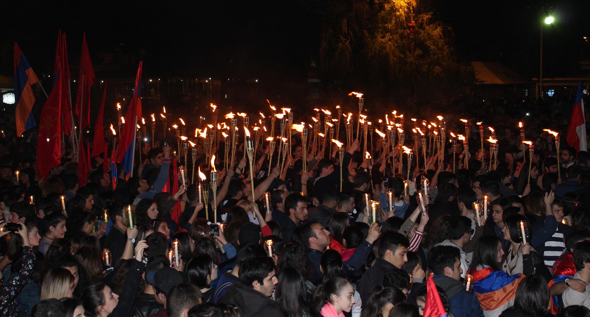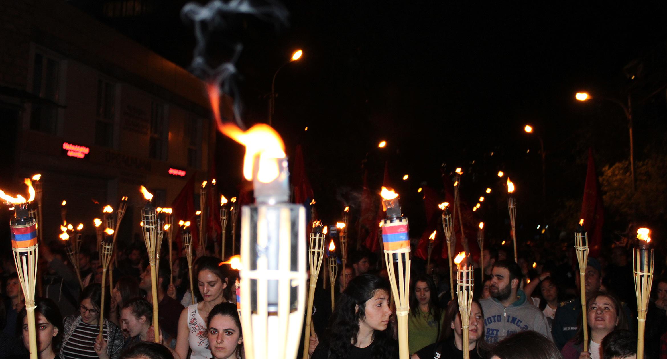 Факелы и лампады в руках участников шествия памяти геноцида армян в Ереване. 23.04.2017