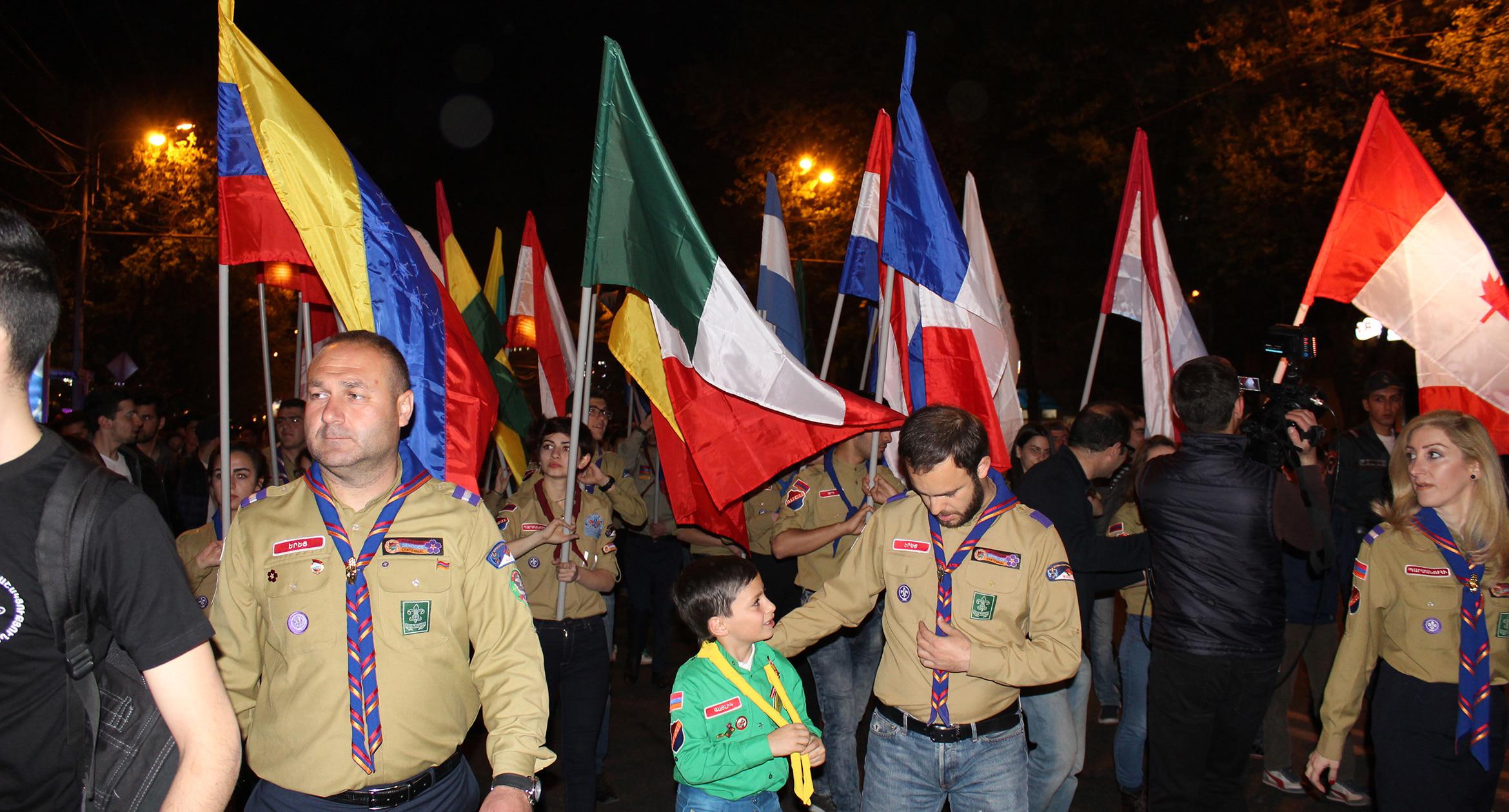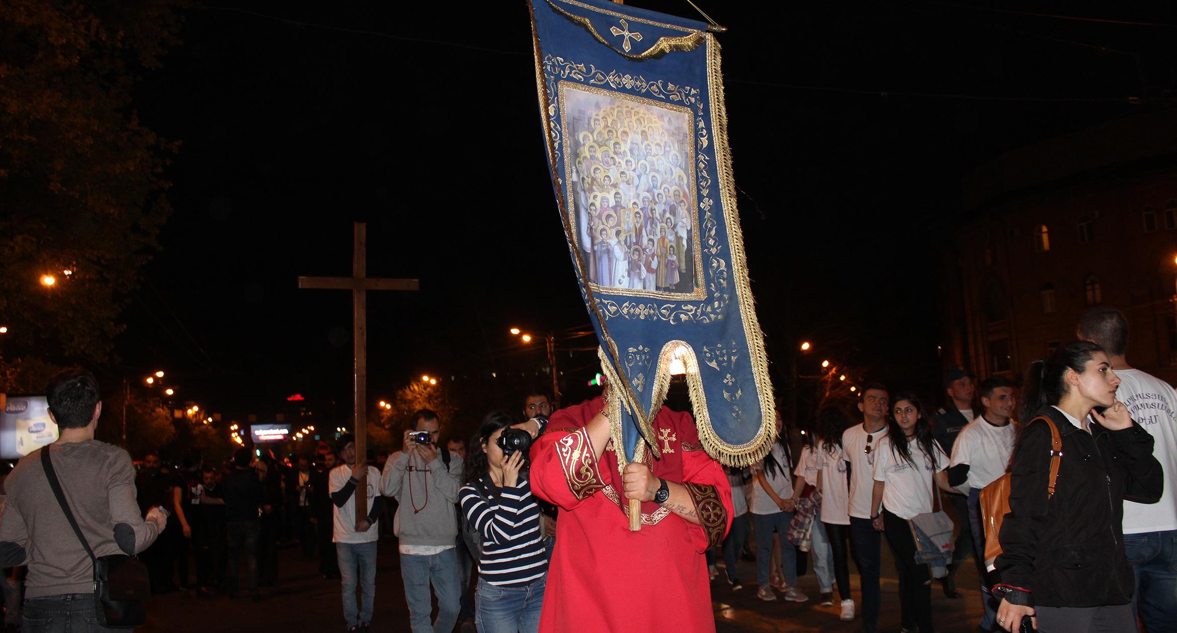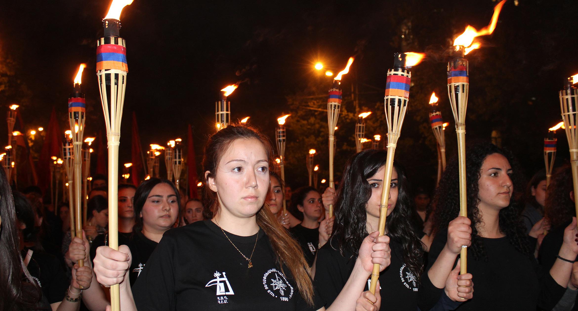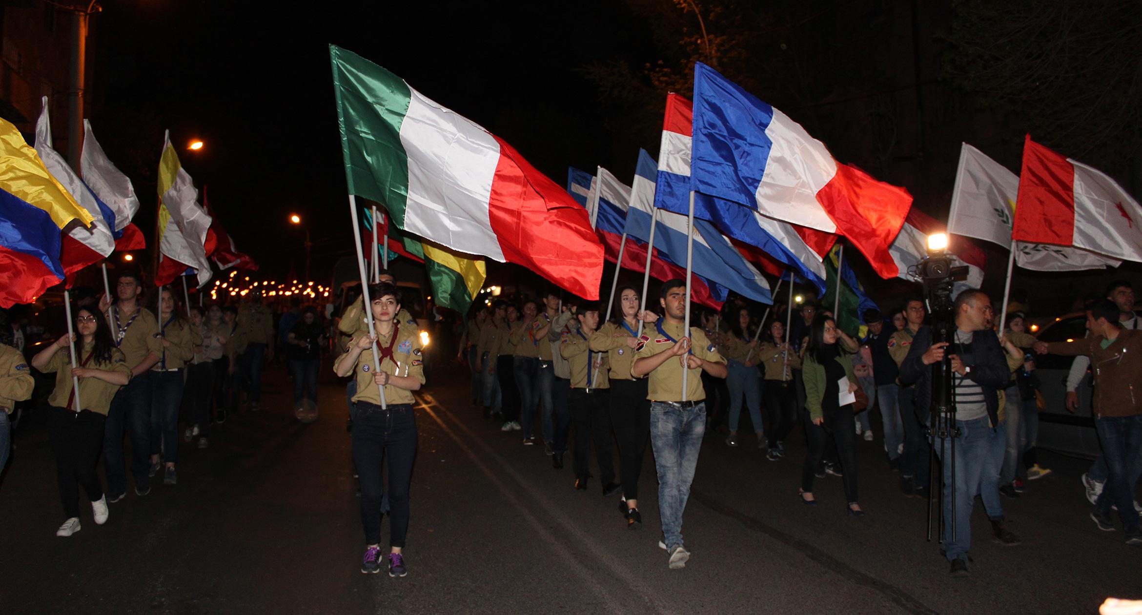 Факелы и лампады в руках участников шествия памяти геноцида армян в Ереване. 23.04.2017