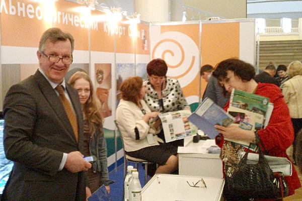 Не только природно-климатические факторы, но и народные костюмы, игрушки-сувениры и национальные лакомства должны были привлечь внимание потенциальных клиентов (стенд санатория Якты-Куль, республика Башкортостан)