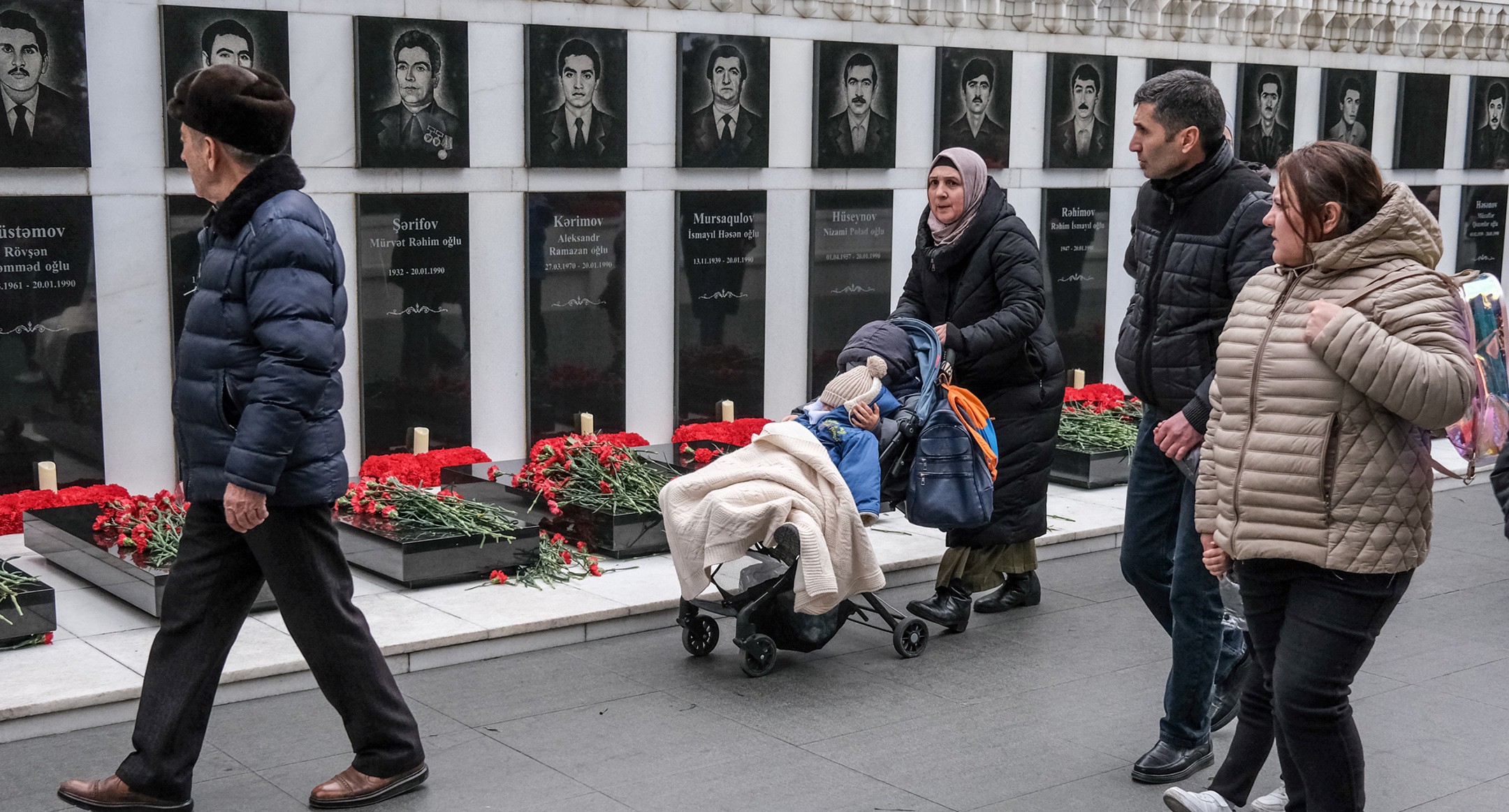 Люди проходят мимо портретов погибших.