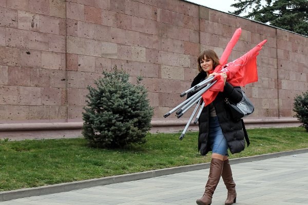 Активистка краснодарского горкома КПРФ Дарья Комарова несет флаги на встречу с депутатами.