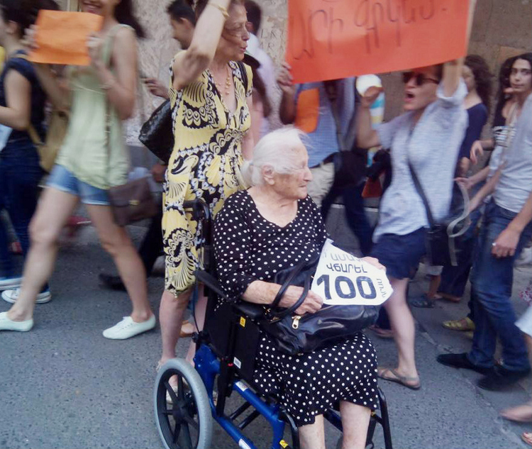 бабушка весь день была с молодыми активистами, она шла впереди шествия по улицам Еревана и просила прохожих присоединиться к акциям. Снимок сделан во время акции протеста против повышения тарифов на проезд в общественном транспорте 24 июля 2013 года.